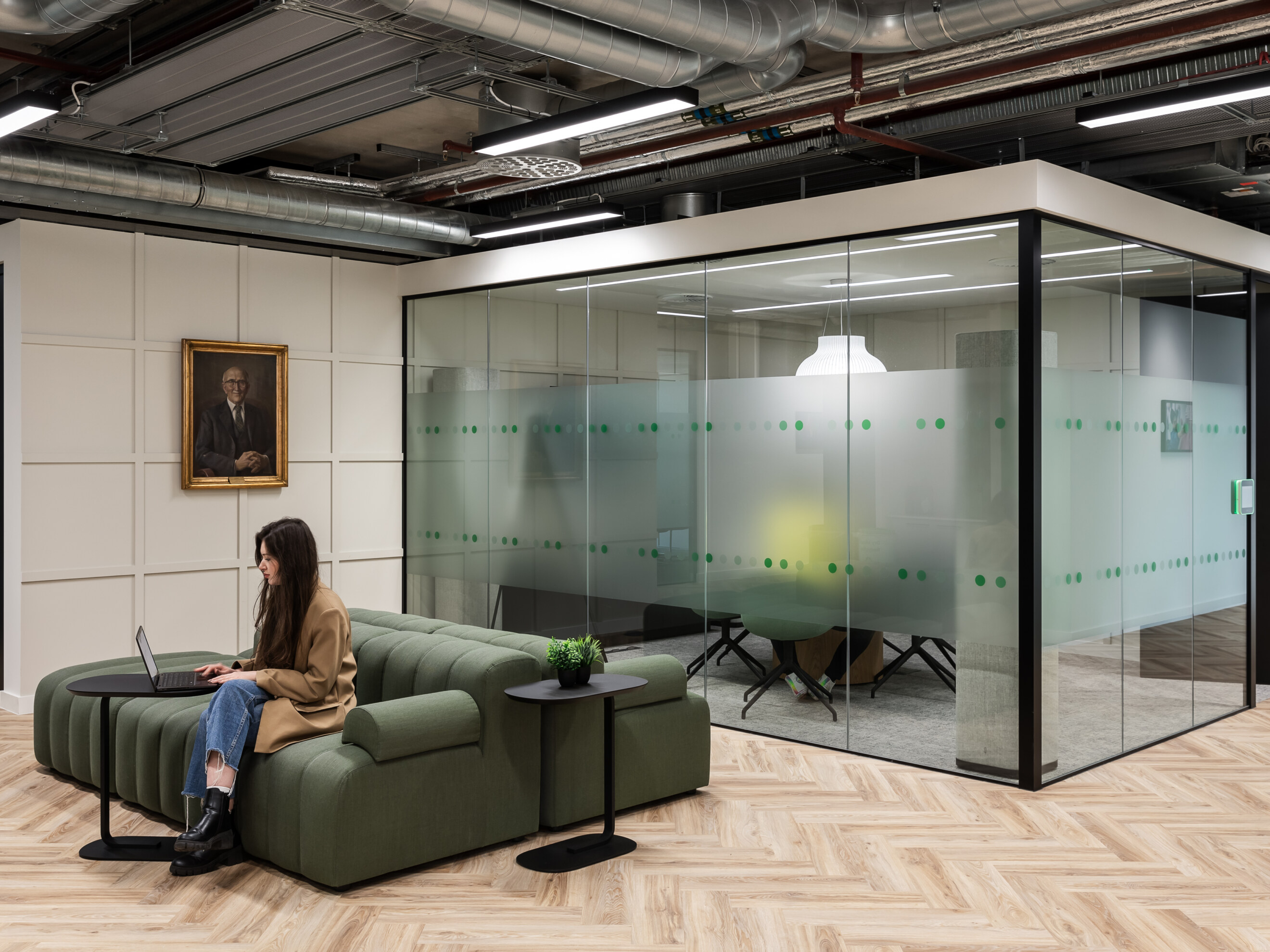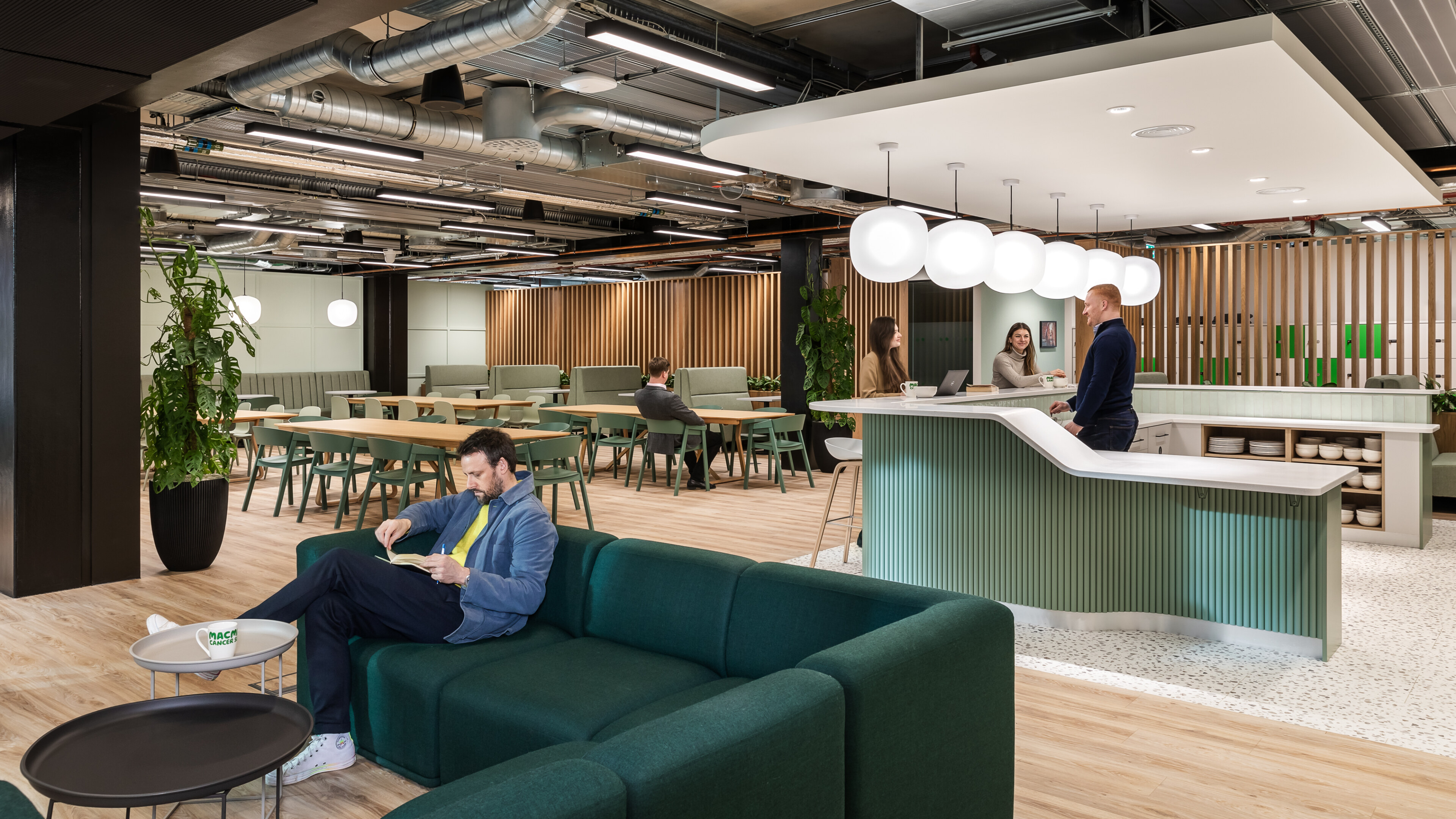 Wellness spaces, including a medical room, prayer room, and a library corner with full-height windows, provide employees with places to reflect, recharge, and relax. “Inclusivity isn’t just a buzzword here – it’s woven into the fabric of the space,” says lead designer Jordan Holdcroft.