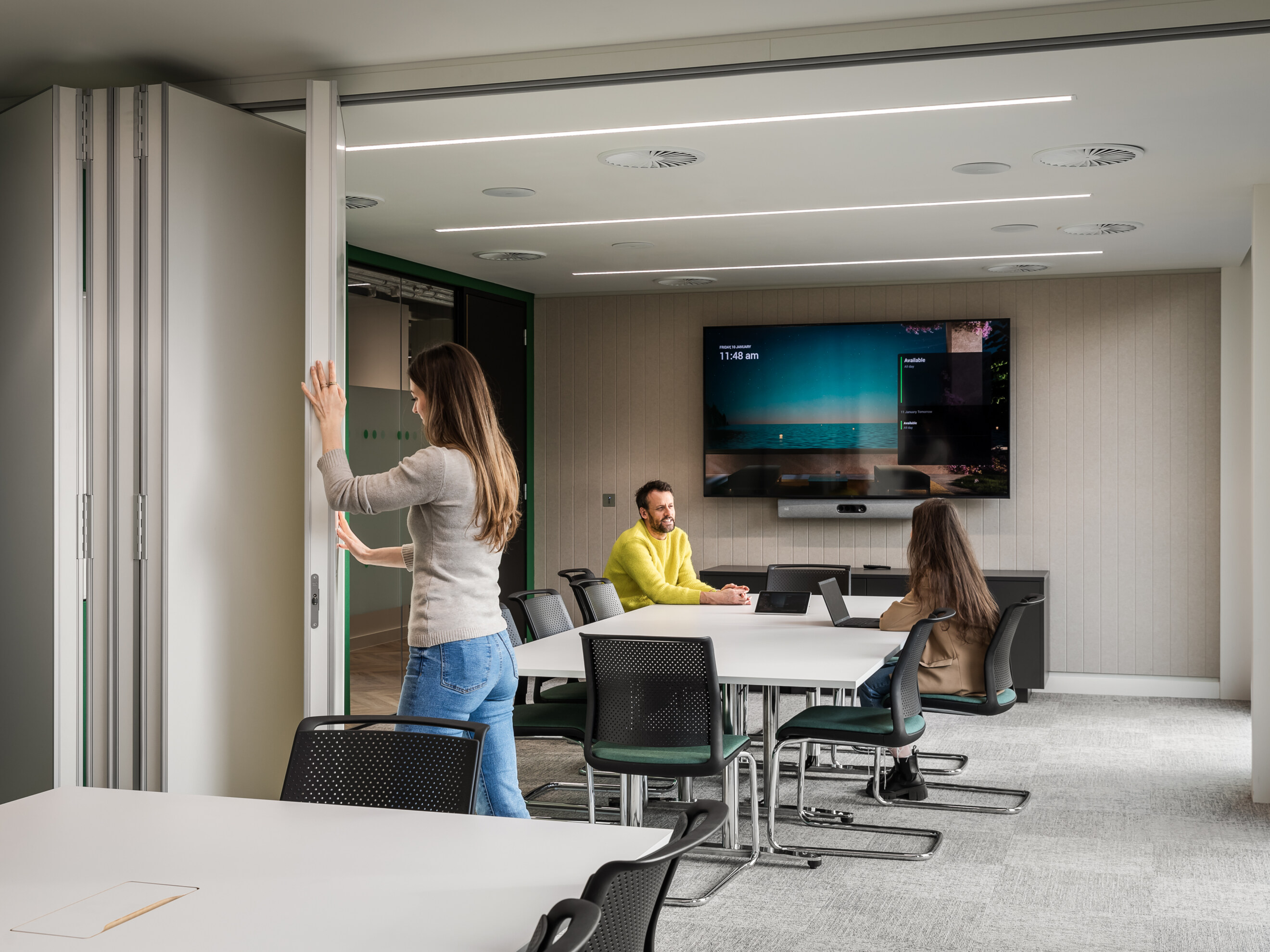 At the hub of the office is a café-style breakout area that flows into a town hall space for community events, ensuring people have a space to connect. Flexible seating and folding walls are infused throughout the space to adapt seamlessly to employee needs, from collaboration to quiet focus. Adding to the versatility, sit-stand and hot desks reflect a modern, dynamic approach to work.