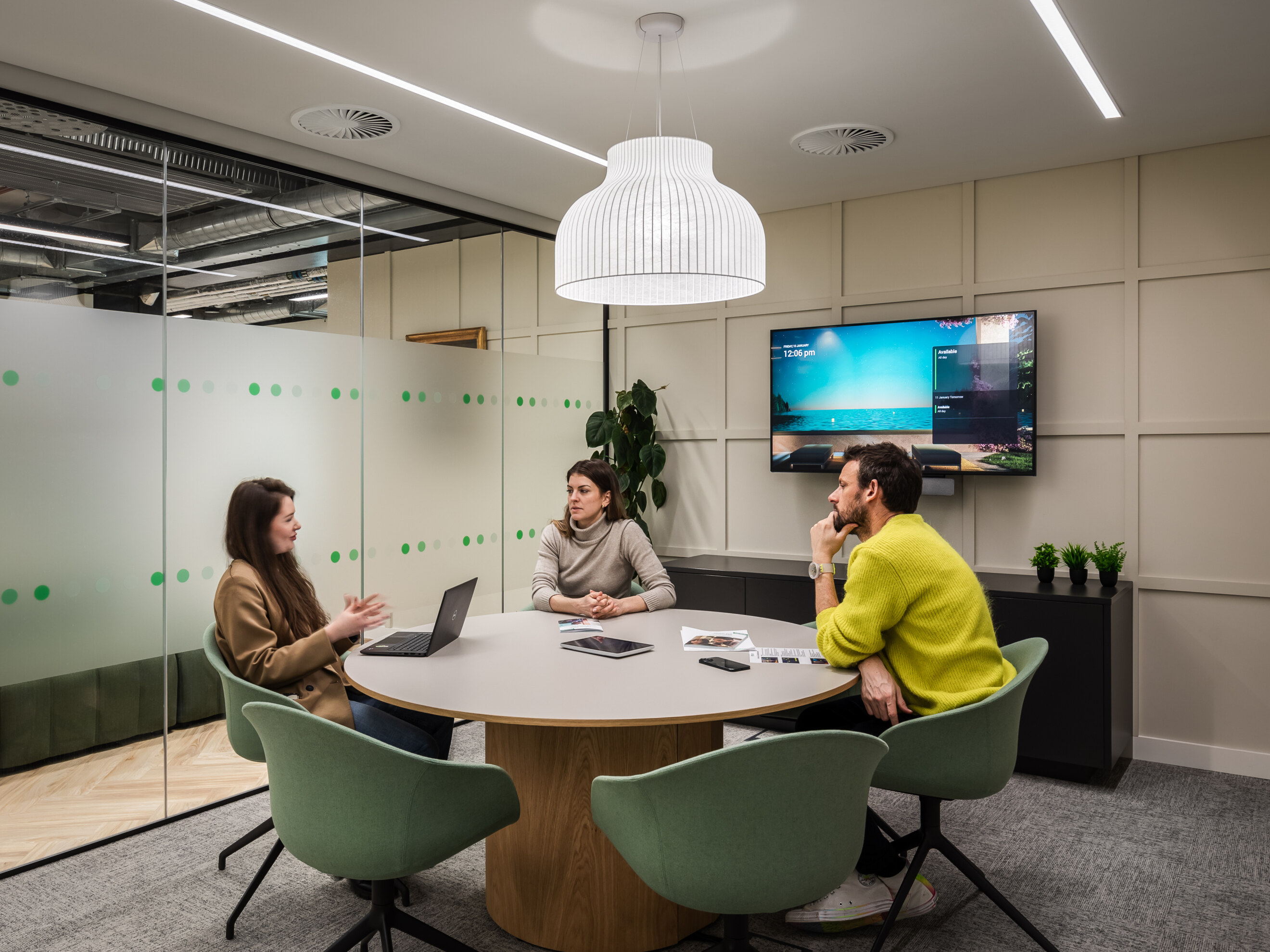 The office exudes a welcoming, home-like atmosphere. Visitors are greeted by vibrant green tones and inviting soft seating, with a self-check-in system replacing the need for a traditional reception desk. Throughout the space, artwork and branding celebrate the carers and people the organisation supports, sharing their stories in a meaningful way.