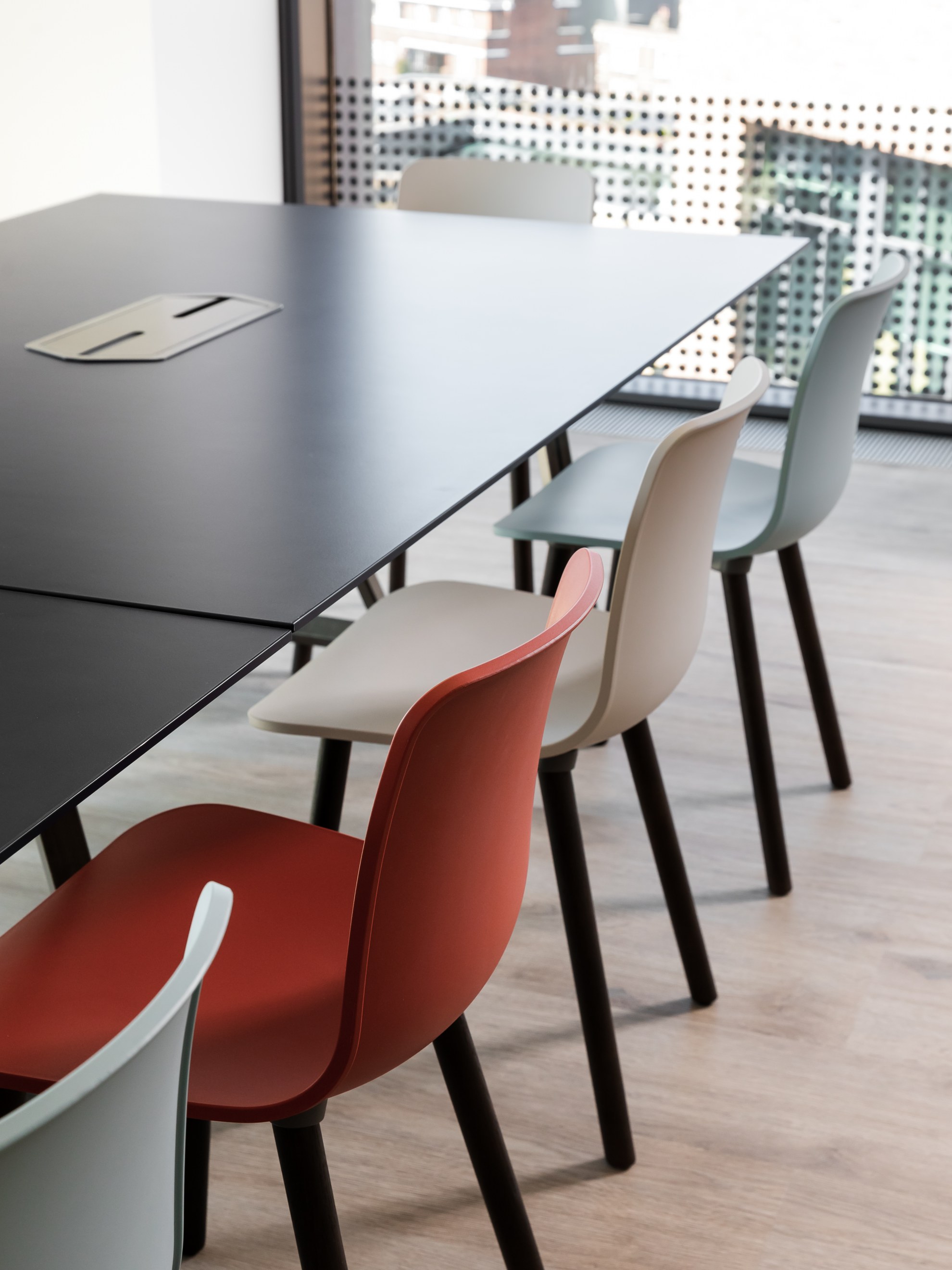 Reliance Cyber’s refreshed workspace helps to encourage productivity with task-based work areas that enable staff to work in a space that is most efficient for them. The workspaces are situated on the exterior of the floorplate, providing access to ample natural light to improve wellbeing, whilst the teapoint offers a bright communal space complete with splashes of colour in the furniture and finishes, helping staff to relax and engage on a more informal basis. The design of Reliance Cyber’s new office employs modest branding alongside natural wood and concrete finishes, resulting in a sophisticated, professional working environment that aligns with their new working processes.